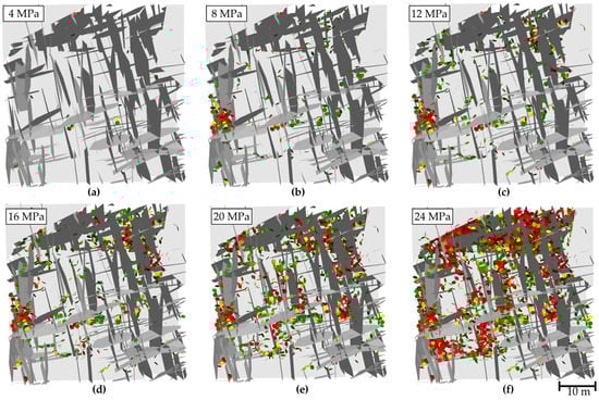 However, by comparing the calculated deformation moduli of the LS-SRM models with the corresponding values of the DFN-Oda-Geomechanics approach and the empirically calculated values, a somewhat larger deviation can be observed. Although the LS-SRM models indicate a good level of agreement with the DFN-Oda-Geomechanics approach in terms of the mean value, the range is reduced, and the values tend to be in the lower part of the range calculated by the continuum approach. In the DFN-Oda-Geomechanics approach, the entire model domain of the DFN model is segmented into a predefined number of grid cells. The equivalent properties such as the deformation modulus are computed with analytical techniques based on the crack tensor theory [31,32]. The crack tensor theory calculates the volumetric average properties of all fractures with respect to their geometrical and mechanical properties, such as orientation, length, aperture or the fracture stiffness of the discontinuities in the respective grid cells. Features or processes such as the formation of new cracks in the intact rock or at existing fractures and their coalescence along a prevailing fracture network are thus not taken into account. In this context, the discontinuum approach of the LS-SRM models offers an advantage, as it allows investigating the potential fracture initiation and propagation within the fractured rock mass. An exemplary sequence of the formation and coalescence of newly formed microcracks, which could ultimately lead to the failure of the rock mass, is shown in Figure 11. It can be observed that at the beginning of the loading stage, isolated microcracks form at the tips of the already existing fractures distributed over the entire model domain (Figure 11a,b). With increasing loading and stress, the amount of microcracks also increases, and the microcracks begin to coalesce at locations with a high fracture density (Figure 11c). If the stress is increased further, the number of microcracks also increases, and microcracks also form in the intact rock, causing more and more fractures to form (Figure 11d,e). Subsequently, as the experiment progresses, more and more microcracks will connect, using the prevailing fracture network as a pathway to form larger fracture planes that will ultimately lead to the failure of the entire rock mass (Figure 11f).