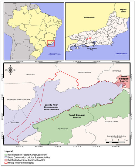 Location of Miguel Pereira municipality in the State of Rio de Janeiro (Brazil), overlaying the Guandu River Environmental Protection Area and the Tinguá and Araras Biological Reserves [35].