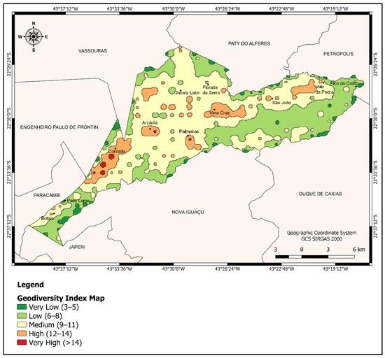 Geodiversity index map of Miguel Pereira municipality, Rio de Janeiro State, Brazil, produced by Gonçalves et al. [23] using the multiparts technique and MOV (Maximum Obtained Value) classification.