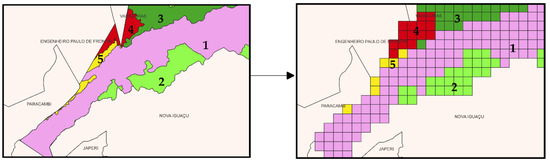 Example of the use of the Zonal Statistics algorithm in the geodiversity map of Miguel Pereira municipality, Rio de Janeiro State, Brazil. The algorithm calculated, by “majority”, the attributes of the 1 × 1 km grid cell which overlaps the geodiversity map (previously converted to a raster layer map). 1-Mountainous Relief constituted by Orthogneisses and Migmatites; 2-Dissected Plateaus; 3-Graben’s Edge Escarpment; 4-Mountainous Relief constituted by Granitoids; 5-Santana River’s Floodplains.