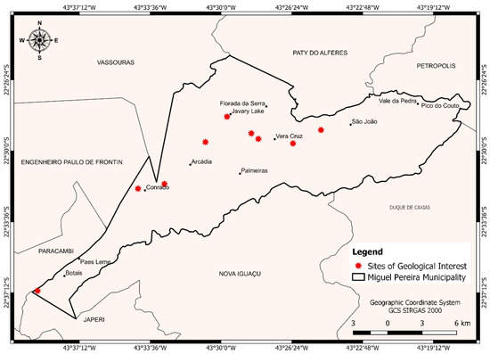 An inventory of geosites or geodiversity sites did not exist for Miguel Pereira municipality, although there are sites with geological interest that can be potential geoheritage sites. These sites were identified through fieldwork while checking the validity of the maps produced through quantitative and qualitative analysis. However, as the aim of the fieldwork was not to perform an inventory of geosites or geodiversity sites, only a potential list was created. It is important to mention that not all the sites visited during the fieldwork were considered in this list, as there are many sites that show similar characteristics. Only the most relevant and accessible sites were selected to produce a map of sites of geological interest (which considers not only geology but also other geodiversity elements such as landforms).