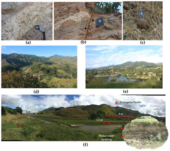 Examples of sites of geological interest in Miguel Pereira municipality: (a) and (b) mylonitised rock associated with the Central Tectonic Boundary (CTB) showing in (a) concordant pegmatite and in (b) subvertical normal fault; (c) diabase dyke with spheroidal exfoliation; (d) viewpoint where it is possible to observe triangular facets, hills, and the Santana River valley; (e) viewpoint at Javary Lake; (f) fluvial terraces with two different levels (4 m and 1.5 m), triangular facets, and planar cross-bedding at the edge of the terrace.