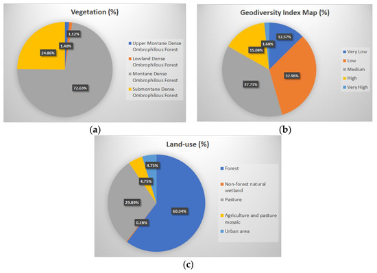 Although the relationship between the geodiversity index map and the other elements demonstrated a weak and very weak correlation using the Pearson’s coefficient, this relationship was positive. Peixoto [61] also performed a correlation analysis between geodiversity and other elements (the land-use map was not used), and the author obtained the same positive correlation with biodiversity and geoheritage. However, only vegetation data were available for Miguel Pereira municipality, which was the only biotic feature considered in the present work. Additionally, the potential vegetation map shows only two dominant classes (Upper Montane and Montane Dense Ombrophilous Forest), which can influence the statistical analysis results showing this very weak correlation. The geodiversity–biodiversity relationship is already demonstrated in various works [28,29,30,31,32,33]. More studies need to be performed to understand this relationship more deeply.