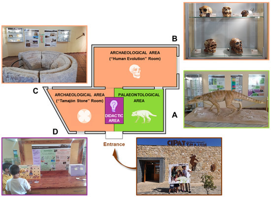 The Palaeontological and Archaeological Interpretation Centre of Tamajón (CIPAT). The map of the CIPAT in the middle, the Palaeontological Area (green, (A)), the Archaeological Area (orange, with the rooms of “Human Evolution” (B) and “Tamajón Stone” (C), and the Didactic Area (purple, (D)), and photographs of the front of the centre (entrance) and of each of the mentioned areas, following the anticlockwise itinerary.