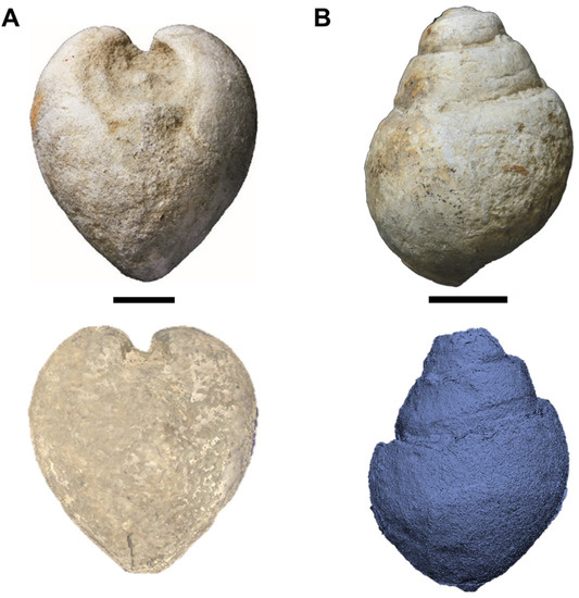 Three-dimensional models of the fossil casts of invertebrate specimens scanned with a small object scanner. (A) Granocardium (Granocardium) productum bivalve photograph (top view) and 3D model (bottom view). (B) Tylostoma torrubiae gastropod photograph (top view), and 3D model with “solid object” option (bottom view). Graphic scales: 1 cm.