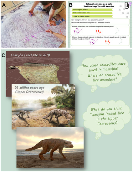 Examples of some of the proposed didactic activities. (A) Track surface mat for the activity “Following Tami´s tracks”. (B) Ichnological report for the activity “Following Tami´s tracks” (Appendix C). (C) Palaeobiological sample of the activity “Discovering the Tracksite of Tamajón” (Appendix D) where different questions are aroused to strengthen scientific thinking and reasoning.