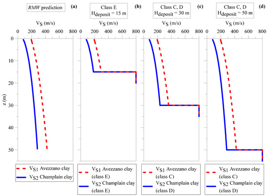 where A, m, and n are dimensionless stiffness parameters, which depend on PI, p’ is the effective mean stress, p’r is the reference pressure equal to 1 kPa, and R0 is the overconsolidation ratio. In particular, A, m, and n are set equal to 2915, 0.22, and 0.78, respectively, for the Avezzano clay and correspond to a PI equal to 10%; they are set equal to 1400, 0.22, and 0.76 for the Champlain clay, consistently with a PI of 22%. The overconsolidation ratio over a depth of 50 m is assumed, on average, equal to 1.2 for the Avezzano deposit and 2.1 for the Champlain clay, as indicated by the corresponding laboratory data. The Champlain deposit is characterised by a VS equal to 280 m/s at 50 m below ground surface (b.g.s.), while the Avezzano clay is slightly stiffer, reaching a VS of about 400 m/s at the same depth. It should be noted that the EC8 soil class depends mainly on the mean shear wave velocity in the upper 30 m, VS30, with the exception of soil class E, for which VS30 is lower than 360 m/s, and for a seismic bedrock depth, Hdeposit, in the range of 5 to 20 m. Accordingly, both Champlain and Avezzano clay deposits should be considered as EC8 class E for Hdeposit = 15 m (Figure 2b). Moreover, the Avezzano deposit can be classified as class C for Hdeposit equal to 30 m and 50 m (Figure 2c,d), while the Champlain deposit is classified as class D for Hdeposit equal to 30 m and 50 m (Figure 2c,d). Considering the Avezzano deposit, VS30 is 378 m/s for a 15 m column and 282 m/s for Hdeposit deeper than 30 m, while for the Champlain clay, VS30 is equal to 234 m/s and 166 m/s at the same depths. It is worth mentioning that EC8 class B is defined by VS30 in the range of 360 to 800 m/s for deposits at least several tens of meters in thickness. Therefore, the case of VS30 equal to 378 m/s and Hdeposit = 15 m is considered to represent a soil of class E rather than class B.