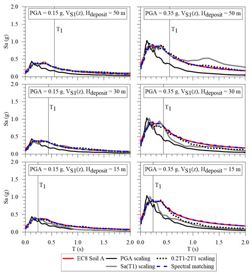 - If the aim is to predict ground surface response spectra, the Sa(T1), 0.2T1-2T1, and full spectral matching strategies give similar results whatever shear wave profile, depth to the seismic bedrock, and peak ground acceleration of the input motion. PGA scaling should be avoided since it provides the lowest intensity ground surface response spectra;