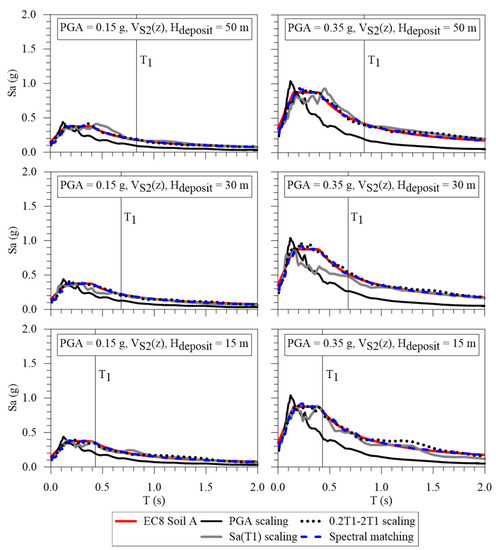 Four different strategies for scaling bedrock motions recorded in soil class A are employed in this work. Specifically, PGA scaling, Sa(T1) scaling, 0.2T1–2T1 scaling, and spectral matching are investigated. PGA scaling focuses only on the average compatibility of the bedrock motions with the target response spectrum (i.e., the EC8 response spectrum for soil class A—Type 1) at 0 s. Sa(T1) scaling seeks for an average compatibility with the target response spectrum only at the first natural period of the soil column. According to the 0.2T1–2T1 scaling strategy, proposed by the EC8, the average compatibility with the target response spectrum is achieved within the 0.2T1–2T1 period range with a lower tolerance of 10%. Moreover, the average PGA of the input motions should not be less than that of the target response spectrum. In this work, it has been implicitly assumed that the fundamental period of the above-surface structure coincides with that of the soil column. This represents the worst condition of double resonance [54,55]. In detail, the first natural periods of the investigated soil columns are calculated using the viscoelasticity theory [56] and an average value of the shear wave velocity over the depth according to the following equation for n = 1:
