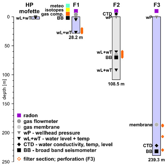 At Hartoušov, geochemical and geophysical fluid properties are monitored continuously in a set of adjacent boreholes at three different depth levels and at the surface (Figure 2; for details, see Fischer et al. [23] and Woith et al. [24]): F1 (aka H1-31b), F2 (aka HJB-1), and F3 (aka HJB-2) were drilled to depths of 28.2, 108.5, and 239.3 m, respectively. This multi-level setup is designed to provide insights into the cause for temporal variations, possibly related to the admixture of crustal or meteoric fluids to an otherwise steady mantle degassing.