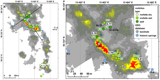 Map of the Hartoušov mofette system showing CO2 flux distribution (from Nickschick et al. [15], light gray colors indicate a CO2 flux above 25 g/d/m2; red colors mark regions with a CO2 flux >50 kg/d/m2), the location of the ICDP research boreholes (F1, F2, and F3), wet and dry mofettes according to [12], historic springs, boreholes (the latter two from GDO (geologically documented objects) database of the Czech Geological Survey), and shallow drillholes (from [27]). (A) Position of SW–NE and NW–SE profiles used for the stratigraphic and hydrogeological profiles shown in Figure 4. (B) Numbers in boxes indicate air-corrected helium isotope ratios (3He/4He)c in RA units from Daskalopoulou et al. [22].