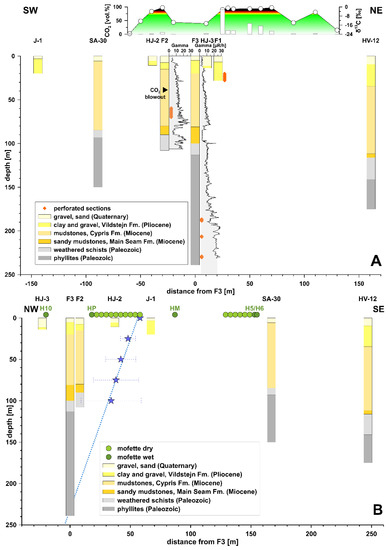 Lithologic and stratigraphic units from drillholes along two transects through the Hartoušov mofette field compiled from Bussert et al. [29], the GDO database of the Czech Geological Survey, and own data for F1, F2, and F3. Site IDs are given at the top of each figure; their locations are shown in Figure 3. (A) SW–NE profile with gamma logs shown for F2 and F3. Inset: Soil CO2 concentrations at 0.4 to 0.8 m depth (white bars) and δ13C values (white circles) along a SW–NE profile located about 20 m to the north of F3 [28]. Greenish colors indicate δ13C values typical for organic material, whereas red to brownish colors indicate mantle origin. (B) NW–SE profile; blue stars mark a channel-like structure obtained from matched field processing of seismic noise data (see Table 2 and Figure 8a in Umlauft and Korn [30]).