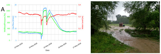 High water level in the nearby meadow likely closed small escape paths for gas, causing almost three times higher measured gas flow through the well and a corresponding response of wellhead pressure (compare similar shapes of green and blue lines in Figure 7A). Two small negative anomalies on all three measured values cannot be resolved, limiting possible interpretations, due to the fast and turbulent flooding behavior that exceeds minimum sampling intervals of 10 min. A possible cause might be the closing and re-opening of gas leakage pathways.
