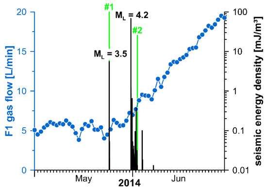 Gas flow rate (daily averages; blue symbols) at F1 during the 2014 earthquake swarm. Seismic energy density (black bars) calculated according to [37] for the site Hartoušov. Vertical green lines indicate two breaking points suggested by the code of [36]: #1 on 23 May and #2 on 2 June 2014 (the height of the green bars is proportional to their relevance).