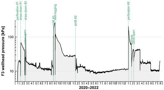 Wellhead pressure at borehole F3 from January 2020 to August 2022. Vertical dashed lines indicate the time of various hydraulic experiments.