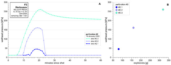 Wellhead pressure changes following three perforation shots on 19 January 2022. (A) Temporal evolution, (B) pressure increase related to the amount of explosives.