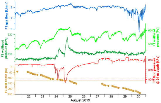 Response of F1 and F2 to drilling activities at F3. From the top: F1 gas flow, wellhead pressure at F1 and F2, and F2 fluid pressure at 94 m depth. The brown curve indicates the progress of the F3 drilling operation.
