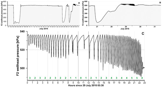 Wellhead pressure excursions at F2 (A) during July 2016, (B) details during 27–31 July 2016, and (C) a zoom showing the oscillations which started 29 July 2016 at 05:30 UTC. The green numbers indicate the frequency of the oscillations in cycles per hour.