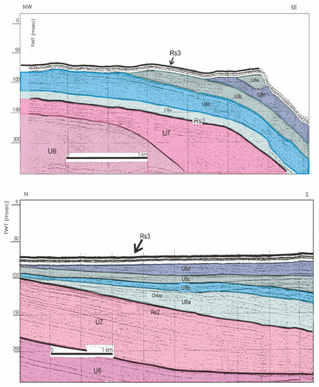 Therefore, the prograding wedge W3, bounded above by the ravinement surface RS3, represents a fourth-order incomplete depositional sequence, composed of a transgressive system tract (unit U8a), a lowstand system tract (units U8b–U8c) and a forced regression system tract (units U8d–U8e), both deposited during the last phases of the last pleniglacial, corresponding to the transition from the isotope stage 2 to 1 (Figure 12). The ravinement surface RS2, bounding at the base the prograding wedge W3 and at the top the prograding wedge W2 formed during a sea level rise at the transition between isotopic stages 6 and 5.