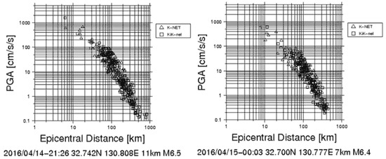 Two sizeable foreshocks of Mw = 6.2 (Mj = 6.5) and Mw = 6.0 (Mj = 6.4) occurred as part on of the 2016 KES on 14 and 15 April, respectively. The focus of the first foreshock was at 32.74 N 130.81 E at a depth of 11 km below the ground surface [1]. The faulting mechanism of this first foreshock was a right-lateral strike-slip mechanism with a maximum recorded PGA of 1.08 g. The focus of the second foreshock was at 32.70 N 130.78 E at a depths of 7 km below the ground surface [1]. The faulting mechanism of the second foreshock was also a right-lateral strike-slip mechanism with maximum recorded PGA of 0.81 g. Figure 2 presents the attenuation trends of the recorded motions for the two foreshock events.