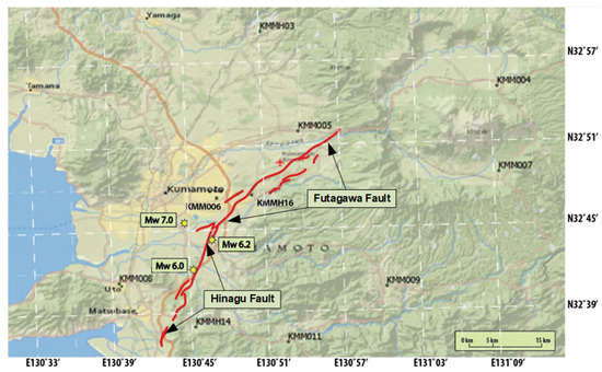 - Okumura, K. Earthquake Geology of the 14 and 16 April 2016 Kumamoto Earthquakes. Kumamoto Earthquake Investigation: A Preliminary Report. 2016. Available online: https://www.google.com/url?sa=t&rct=j&q=&esrc=s&source=web&cd=&cad=rja&uact=8&ved=2ahUKEwi996bU65j8AhVFmVYBHc0GBq0QFnoECAoQAQ&url=https%3A%2F%2Fs21.q4cdn.com%2F920789611%2Ffiles%2Fdownload_library%2Fscientech%2FKumamoto-Earthquake-Investigation-Preliminary-Report.pdf&usg=AOvVaw3kPCpHO-kQIG-edkKFnkS1 (accessed on 20 November 2016).