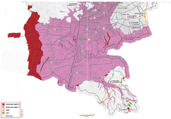 Liquefaction hazard map for the Kumamoto Plain at the time of the 2016 KES (after [37]).