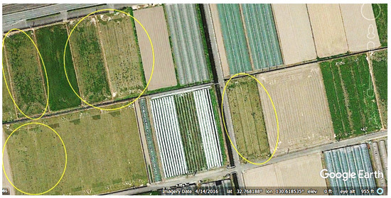 In the days immediately following 2016 KES mainshock, an engineering reconnaissance team was organized by the Geotechnical Extreme Events Reconnaissance Association (GEER), which is sponsored by the US National Science Foundation. This team represented a joint Japanese–American effort and was comprised of researchers from both countries. Three of the authors were members of that team [1]. Initial evidence emerging from the preliminary “virtual” reconnaissance efforts suggested that surface manifestations and subsequent infrastructure damage from soil liquefaction was likely to be encountered throughout much of Kumamoto and the surrounding area. First, as shown in Table 1, the ground motions recorded by the earthquake were more than sufficient to generate cyclic shear ratios (CSRs) large enough to trigger soil liquefaction in even moderately susceptible soils. Second, team members understood that the Kumamoto Plain contained large amounts of young (i.e., Holocene) alluvial deposits and shallow groundwater. These soils are among the most susceptible to earthquake-induced soil liquefaction [36]. Third, preliminary investigation of publicly available soil boring logs throughout the Kumamoto Plain largely indicated substantial amounts of saturated and loose to medium-dense “fine sand” soil (translated from Japanese) as evidenced by recorded SPT blowcounts in the range of 4 to 20 hammer blows per 0.3 m. Fourth, a publicly available liquefaction hazard map of the region [17] indicated that the entire Kumamoto Plain had an extremely high liquefaction hazard, as demonstrated in Figure 5. Finally, post-event aerial and satellite imagery showed several curious and small black circles scattered throughout the fields in the Kumamoto Plain and in the Mount Aso crater, as demonstrated in Figure 6. These circles were identified as possible sand boils and evidence of surface manifestation of liquefaction. Field investigation later revealed these circles to be bundled and burned rice stalks corresponding with the end of the recent rice harvest in the area [1].