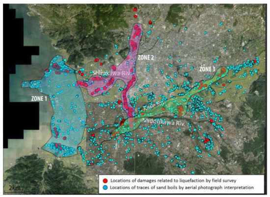 Locations of suspected liquefaction from aerial photographs (shown in blue) and of confirmed liquefaction from field surveys (shown in red); altered from Mukunoki et al. [17] by Anderson [40].