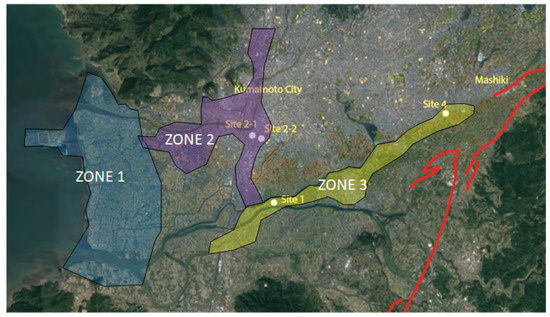 Sites 2-1 and 2-2 were chosen to test Zone 2 (i.e., the liquefied river channels). Sites 1 and 4 were chosen to test Zone 3 (i.e., the liquefied levees and fields in the south of the Kumamoto plain). Site 1 was chosen because of its proximity to liquefied farm fields, but no surface manifestation of liquefaction was observed at the site. This neighborhood experienced no liquefaction and was located on a natural levee. Site 2-1 was chosen because it experienced the most severe liquefaction in Kumamoto city. Site 2-2 was located nearby to site 2-1 and suffered no obvious liquefaction damage. Site 4 was located on a former river channel on the Akizu River that has now been transformed into a backyard farming plot. The site is located close to the epicenter and was chosen because liquefaction evidence was observed at the site in the form of ground cracking typically consistent with lateral spread displacement. Table 2 summarizes the location of the selected sites [46].