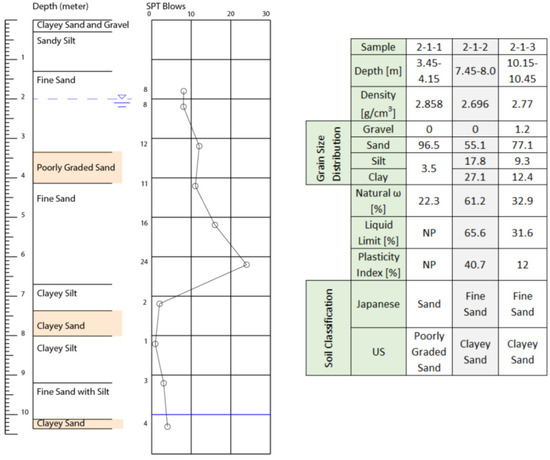 The low SPT penetration resistances in the publicly available boring logs may be the result of soil crushability. Additionally, geological maps roughly indicate around 10 m of sand and silt that encompass the surface of the Kumamoto Plain [17]. The sandy soils that were encountered in the test holes in this study usually had high fines content and plasticity. If the test holes from this study are in any way representative of other soil deposits in the Kumamoto Plain, that would explain the lack of significant liquefaction in these sandy deposits. The high fines content would have been the product of rapid weathering volcanic glass.