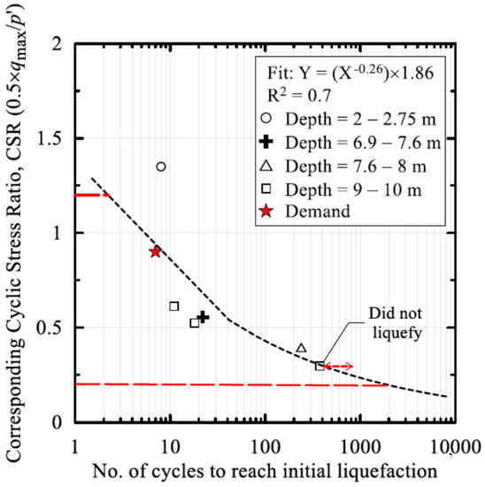 The results of the triaxial cyclic shear tests from Site 2-1 are presented in Figure 13. The star in the figure represents our best estimate of the peak cyclic stress ratio (CSR) that the native soil was exposed to during the 2016 KES. The line in the figure represents the best-fit trendline for approximating the liquefaction triggering boundary. Based on our interpretation of the test, the native soil is located very near to the regressed liquefaction triggering boundary, further providing laboratory evidence that the majority of the soils at Site 2-1 either liquefied or were very close to liquefying. Additional undrained cyclic shear tests from Site 2-1 could be performed in future research to further test our observations made here based on our minimally disturbed samples. Ideally, frozen and cored samples of soil should be tested in future research.