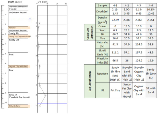 Because of the proximity to the Aso terraces, the soils at Site 4 are more heavily influenced by the Aso Caldera. At a depth of 9 m is the Aso-4 pyroclastic flow deposit, which at this proximity to the Caldera is relatively near to the surface compared to other sites on the Kumamoto Plain. Above this flow deposit is a thick layer of peat. Above the peat is a young deposit of volcanic sediment. The river has been extensively altered in the last 40 years, being widened and redirected [40]. Recycled materials from the adjacent floodplain were used to fill in this area and were most likely clayey and organic, making compaction difficult.