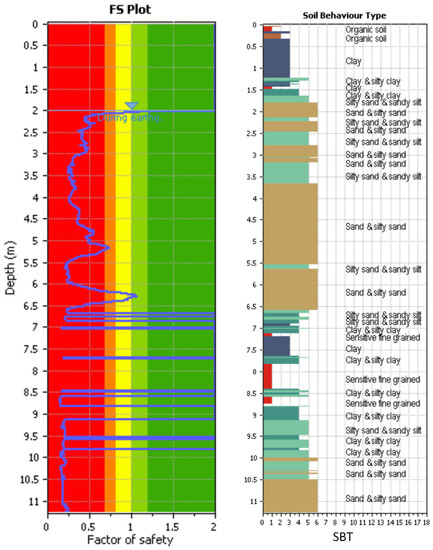 CPT liquefaction triggering results and SBT plot for Site 4 (modified from Anderson [40]).