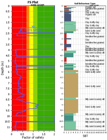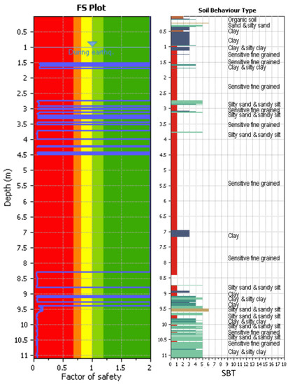 Evaluation of the compositional criteria for the soils in encountered in the boring performed at Site 4 showed that no soils encountered in the boring were susceptible to liquefaction triggering based on the compositional criteria used in this study [47,48]. Therefore, no liquefaction triggering analysis was performed with the SPT data.
