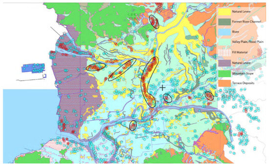 Kumamoto Plain geomorphological map with confirmed liquefaction sites (red). Circled sites represent former river channels and constitute the most common locations where liquefaction surface evidence was observed. Modified from [17]. After [40].