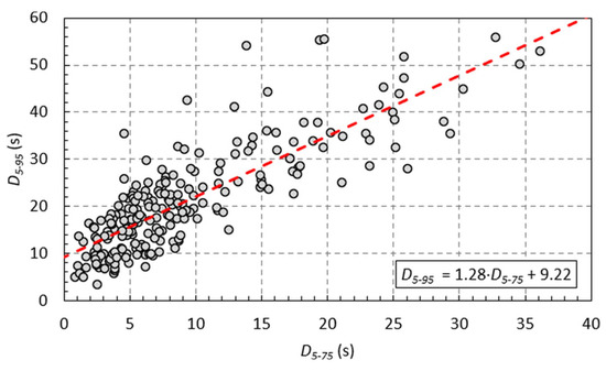 Evaluation of the correlation between D5-75 and D5-95. The fitted linear trendline is shown with the red dashed line.