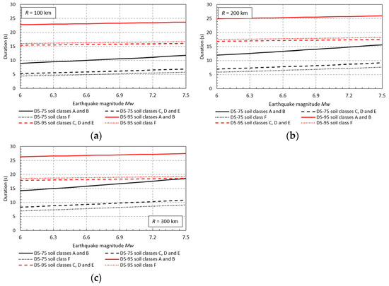 Variation of D5-75 and D5-95 as a function of the earthquake magnitude and soil class for (a) R = 100 km; (b) R = 200 km; and (c) R = 300 km.