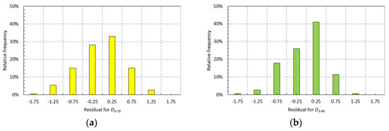 The histograms of the residuals (difference between the observed and predicted values) for D5-75 and D5-95 are analyzed in Figure 6. The mean values of the residuals are −0.03 for both D5-75 and D5-95, while the median values of the residuals are 0.01 for D5-75 and 0.03 for D5-95, respectively. From the two plots, it can be observed that the distribution of the residuals for D5-75 is more symmetrical about zero compared to the residuals’ distribution for D5-95.