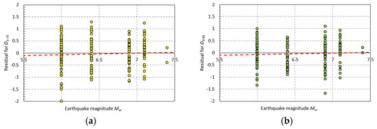 Distribution of the residuals as a function of the earthquake magnitude for (a) D5-75; (b) D5-95. The fitted linear trendlines are shown with the red dashed lines.