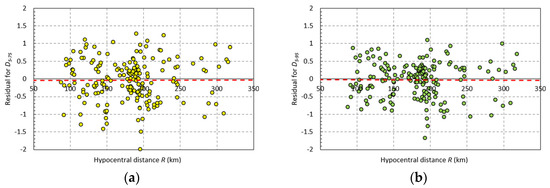 Distribution of the residuals as a function of the hypocentral distance for (a) D5-75; (b) D5-95. The fitted linear trendlines are shown with the red dashed lines.
