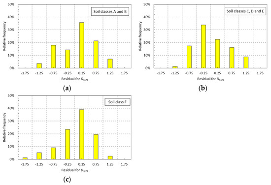 Histograms of the residuals for D5-75 as a function of the soil class: (a) soil classes A and B; (b) soil classes C, D, and E; (c) soil class F.