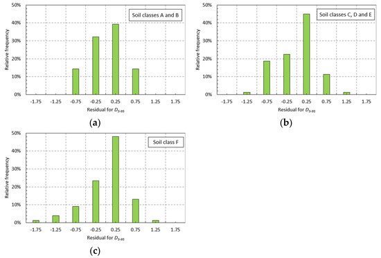 Histograms of the residuals for D5-95 as a function of the soil class: (a) soil classes A and B; (b) soil classes C, D, and E; (c) soil class F.