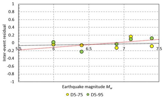 Distribution of the inter-event residuals as a function of the earthquake magnitude for D5-75 and D5-95. The fitted linear trendlines are shown with the black and red lines.