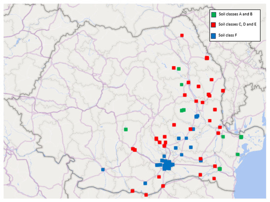 An analysis of the geographical distribution of the residuals is performed in this section for the three earthquakes with the largest number of ground motion recordings in the database that was compiled for this study (the 30 August 1986; 30 May 1990; and 27 October 2004 events). The soil conditions of the recording seismic stations (three categories of soil conditions, as defined in this study) are shown in Figure 14. It has to be emphasized that long-period spectral amplifications have been observed for the seismic stations located in the southern part of Romania [36]. In addition, in the study by Pavel et al. [37], the site response analyses performed using the data from five deep boreholes in Bucharest showed a significant impact of the rock ground motion amplitude (and earthquake magnitude) on the frequency content of the free-field ground motion. The azimuthal dependence of the ground motion amplitudes of Vranceaintermediate-depth earthquakes has been studied by Sokolov et al. [25], Pavel and Vacareanu [38], and Pavel [39]. An important observation of these studies is related to the significant attenuation differences between the areas situated in the front of the Carpathian Mountains (fore-arc region) compared to the areas behind the mountain range (back-arc region).