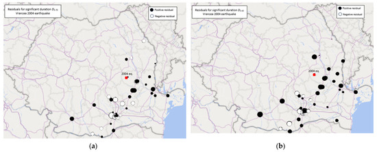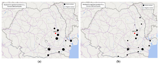 Figure 15, Figure 16 and Figure 17 show the geographical distribution of the residuals for the three earthquakes in the database with the largest number of available ground motion recordings (the events of 30 August 1986; 30 May 1990; and 27 October 2004). In Figure 15, Figure 16 and Figure 17, the size of the residuals (difference between observed and predicted value) for a particular seismic station and event is proportional to the size of the circles. It can be observed that for all three events, the residuals of the seismic stations situated towards the northeastern part of Romania are small, thus yielding predictions close to the observed values for both significant duration definitions. In the Dobrogea area, situated in the eastern part of Romania and bordering the Black Sea, the residuals are, in almost all cases, positive, showing larger observed durations compared to the median predictions using the proposed empirical model. In the case of Bucharest, except for the 1986 earthquake, for which the residuals are almost all positive, in the case of the other two events (1990 and 2004 earthquakes), the residuals are both positive and negative, without a specific trend. Finally, larger residuals can be observed toward the southwestern part of Romania (including Craiova), but this aspect needs further validations with more ground motion recordings.