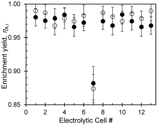Figure 5 illustrates the tritium yield calculated for each cell in the experiment using Equation (5). The graph depicts a high level of tritium enrichment yield (more than 0.95) with minimal variability across the 13 cells, except for cell #7. The sudden decrease in performance observed in cell #7 could be attributed to an inadvertent reversal of the cell polarity, which occurred once by mistake during the experiment. For this reason, cell #7 was not used again for the electrolysis process.
