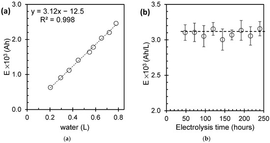 The energy required for the electrolysis process was examined with regard to the volume of water used. Figure 7a illustrates a linear correlation, suggesting that a consistent amount of energy is needed for the electrolysis of each liter of water. This means that energy consumption remains relatively constant regardless of volume. In Figure 7b, the estimated energy consumption is approximately 3150 ampere-hours (Ah) for each liter of water. This measurement indicates the energy needed to carry out the electrolysis process for a given volume of water. The data presented in Figure 7 help us to understand the energy requirements and efficiency of the electrolysis process. This shows that as the volume of water needed for electrolysis increases, the overall energy consumption also increases proportionally.