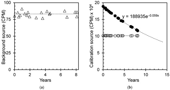 In contrast, the standard tritium source (3H) displayed an exponential decline in the count over the last eight years since the device was initialized. The count reached approximately 0.6162 times the initial count (Figure 8b). By analyzing the gradual exponential curve and decay equation, a rough estimation yielded a half-life of approximately 11.75 years for 3H, which is in close agreement with the published value of 12.3 years reported in the literature [30]. The stable background count and consistent 14C count over time indicate the excellent performance of the liquid scintillation device. It is worth noting that the background effect can be disregarded if the measured value is approximately 1000 times greater than the background count.