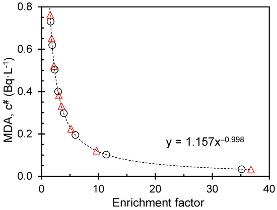 The relationship between the enrichment factor and the minimum detectable activity is essential because it helps determine the analytical performance of the method. MDA is the lowest concentration that can be reliably detected and quantified. As the minimum detectable activity (MDA) decreases, the method becomes more sensitive, allowing it to detect lower concentrations effectively. Figure 9 shows the minimum detectable activity as a function of the enrichment factor of the electrolysis process for two typical samples of 5 and 7 (black circles and red triangles). The figure shows a reverse relationship between the enrichment factor and the minimum detectable activity (MDA) in radioactivity measurements. The enrichment factor is defined as the ratio of the activity of the target in the enriched sample to the activity of the same in the original, unenriched sample. The target is concentrated by enriching the sample, increasing the signal-to-noise ratio, and improving the analytical method’s sensitivity. As a result, MDA is reduced, meaning that lower target levels can be reliably detected and quantified. In other words, as the enrichment factor increases, the MDA decreases. Therefore, by increasing the enrichment factor, MDA can be reduced, making it easier to detect and quantify low concentrations.