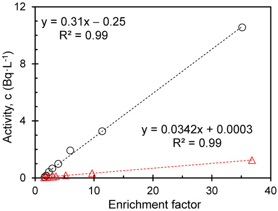 To understand the related activity of tritium, it is necessary to consider the enrichment factor, which quantifies the increase in the concentration of the tritium isotope. By applying the enrichment factor, one can calculate the corresponding activity of the enriched material. This calculation considers both the enrichment factor and the initial activity of the tritium. The activity of the enriched water is plotted against the enrichment factors shown in Figure 10. A linear correlation can be seen, inferring that the activity concentration of tritium increases with the enrichment of the water samples.
